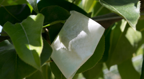 「袋かけ」の作業は、果実を病害虫から守るために欠かせません。二十世紀梨は、実が小さいうちは小袋、大きくなってきたら大袋と、袋かけを2回行わなければいけないので特に大変です。しかし、そのおかげで美しい緑色の二十世紀梨が出来上がるのです。
